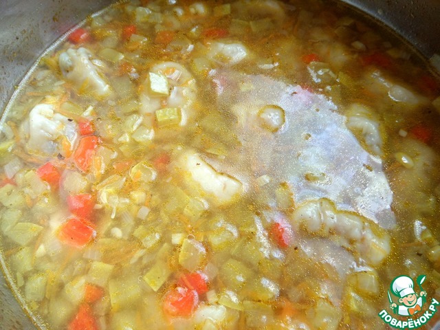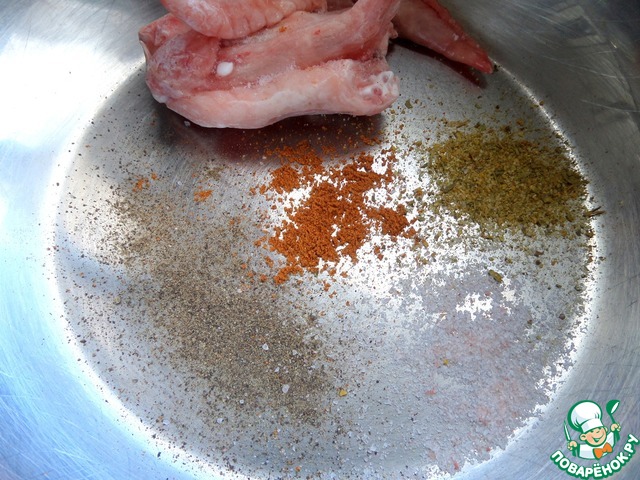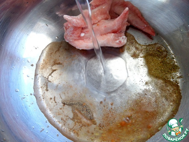 Вообще я начинала готовить с "пельмешек", но тут начну с основы-супа. Его можно готовить без мясного, так как будет фарш потом, но я добавила из заморозки пару крылышек+специи.