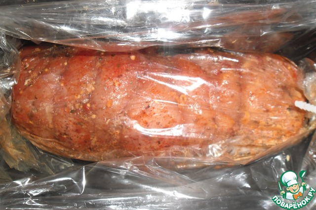 Теперь надо уложить этот "кокон" в рукав для запекания, плотно обернуть и закрепить края, выдавливая воздух из рукава. Этот свёрток я положила ещё в пакет для запекания размером 35 на 43 см. Плотно завернуть и убрать в холодильник на 10 часов. Периодически переворачивайте мясо, для равномерного пропитывания специями.