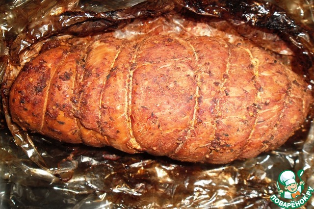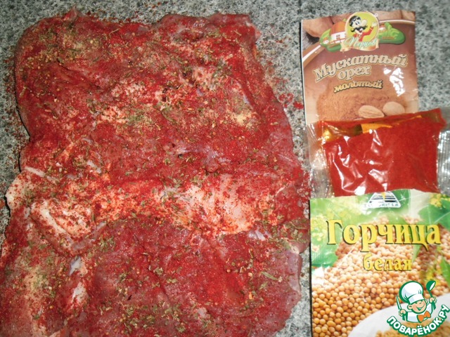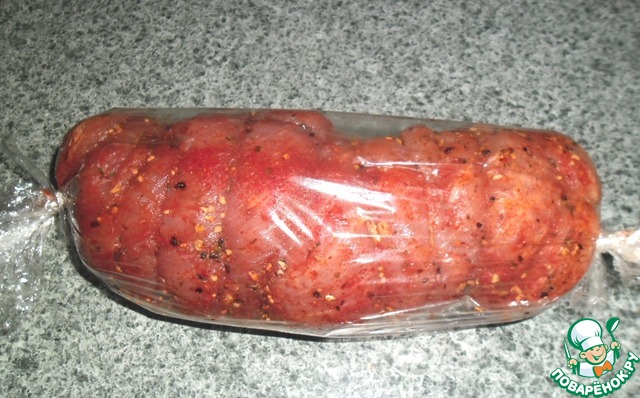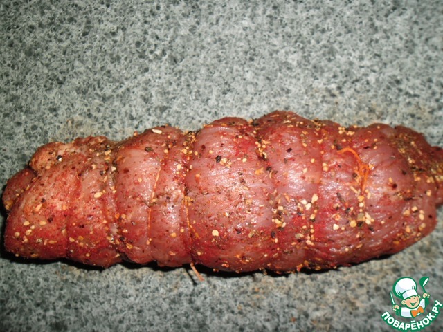 Получился вот такой "кокон". Оставшиеся специи распределим по всей поверхности, как бы вбивая в мясо.