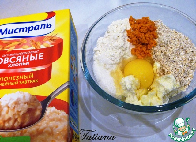Добавьте к массе муку и измельченные овсяные хлопья. Тесто вымешайте (удобно растирать ложкой). Возможно вам покажется что тесто не достаточно "густое"-добавлять ни муку, ни хлопья не стоит. Когда тесто постоит, то овсяные хлопья набухнут, и тесто "примет" нужную консистенцию.