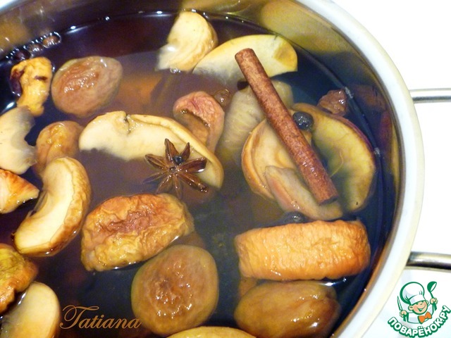 Смесь сушеных фруктов (яблоки, груши, чернослив, курага, урюк, инжир, изюм)-промойте в теплой воде. Сварите компот в 1,5 литре воды. Как только компотная смесь закипит, выключите нагрев, добавьте сахар и специи, дайте компоту настояться 6-10 часов. (удобно приготовить компот вечером, а уже утром из готового компота очень быстро приготовить кисель).