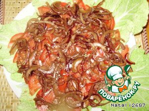 • Затем маринованный лук (нарезать полукольцами, смешать с бальзамическим уксусом, соевым соусом и кунжутным маслом, и дать промариноваться).