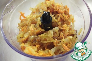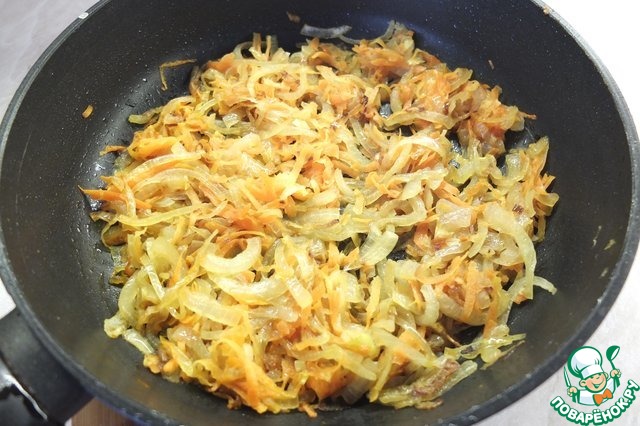 Обжариваем лук до золотистого цвета, добавляем морковь и обжариваем доя мягкости.