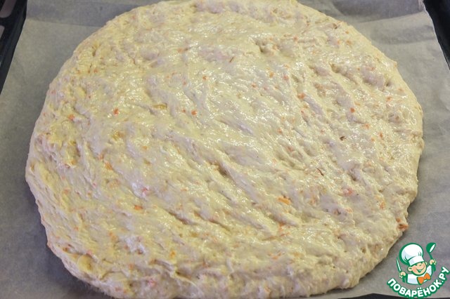 • Смазываем руки растительным маслом и выкладываем тесто на застеленный пергаментной бумагой противень, формируя лепешку.