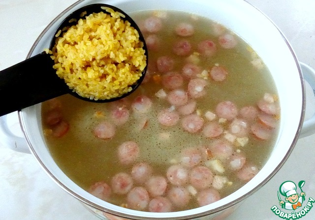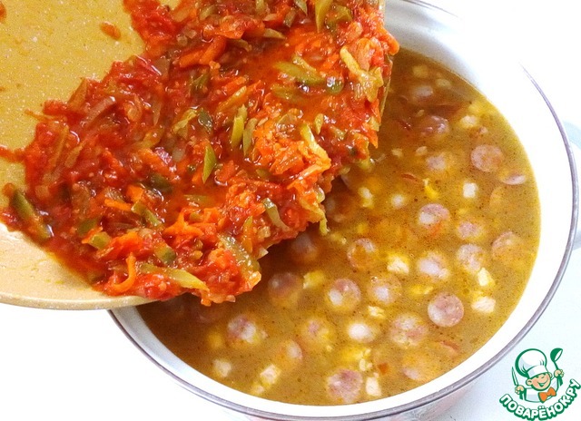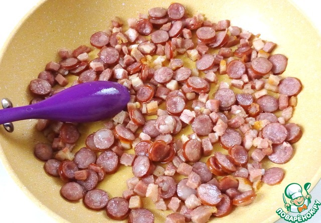 Как только закипит вода, добавить нарезанный картофель, немного подсолить и дать полностью свариться. На это уйдет 15 минут. Пока варится картофель, обжарить все ингредиенты. Для начала на сухой сковороде обжарить грудинку, чтоб вытопился жир, добавить к ней колбаски. Помешивая, обжарить пару-тройку минут на небольшом огне. Добавить копчености в суп к картофелю, пусть варятся вместе.