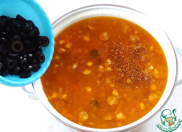 После этого добавить свежемолотую смесь перцев и нарезанные на два-три колечка оливки. Варить еще 5 минут, выключить огонь.