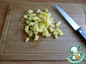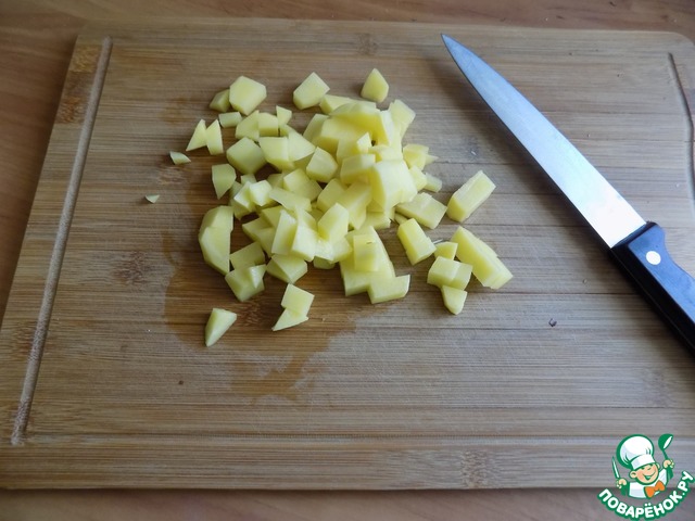 Картофель режем мелким кубиком и отправляем в кипящую воду в кастрюлю, где будем варить суп. Картофель варим до готовности.