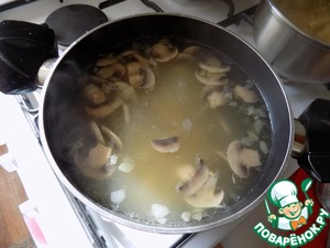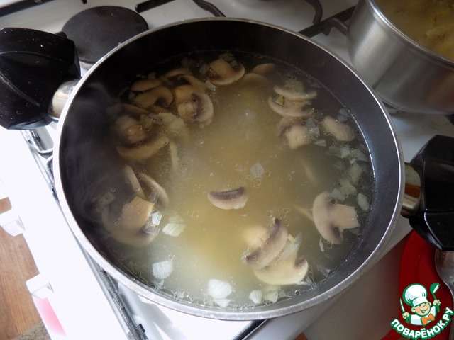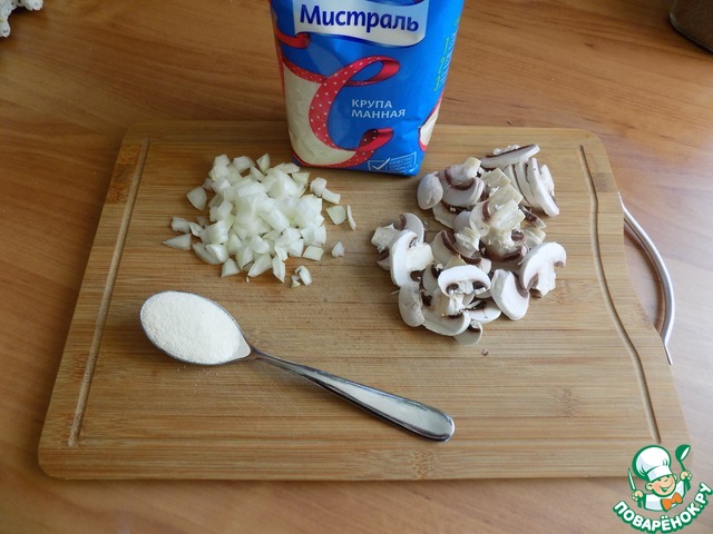 Это всё, что нам для супа пригодится. Лук режем мелко, шампиньоны "грибочками". Для супа нам понадобится всего 1 ст л манки, не переложите, чтобы суп не стал кашей. Она нам нужна для густоты и насыщенности бульона и она соединит наш бульон с продуктами в супе.