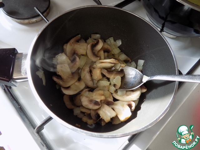 Пока картофель варится, обжариваем лук с шампиньонами. Лук я позолотила в разогретом масле и выложила грибы. Больше притомила, вы можете обжарить грибы посильней.