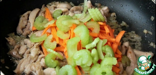 Добавить морковь и сельдерей, обжаривать до готовности всех ингредиентов.