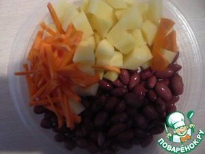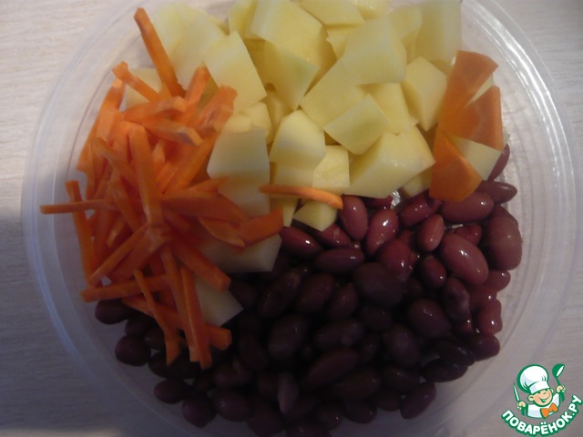 Предварительно отваренную фасоль ( как по инструкции на упаковке), картофель нарезанный кубиком и натертую морковь отправляем в кипящую воду.
