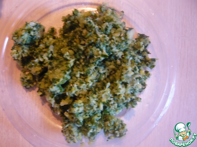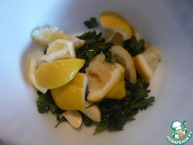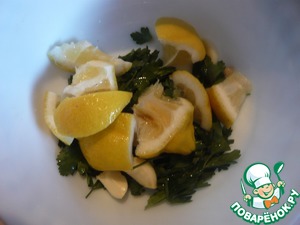 В это время делаем соус гремолата. Пучок петрушки, чеснок и лимон отправляем в блендер.