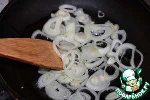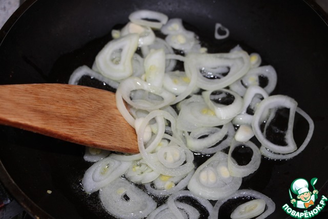 Лук порезать тонкими полукольцами. Обжарить на растительном масле 5 минут, не зажаривая.