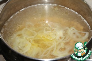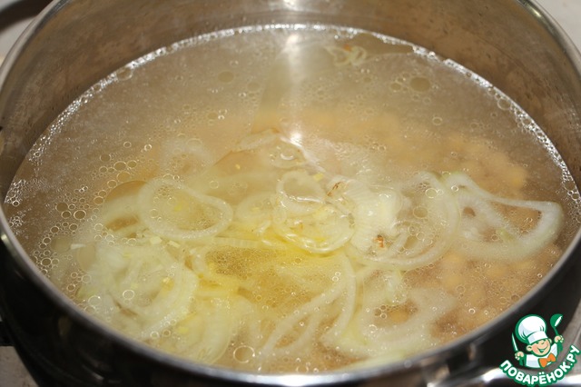 В кипящую воду или бульон добавить оставшийся настой шафрана, лук и нут. Довести до кипения, варить 1,5 часа.