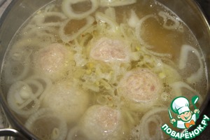 Опустить их в кипящий суп. Варить до готовности фрикаделек, минут 10.