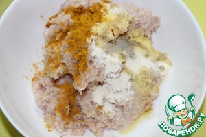 Молотый белый перец, куркуму, соль по вкусу и половину настоя шафрана.