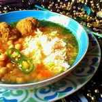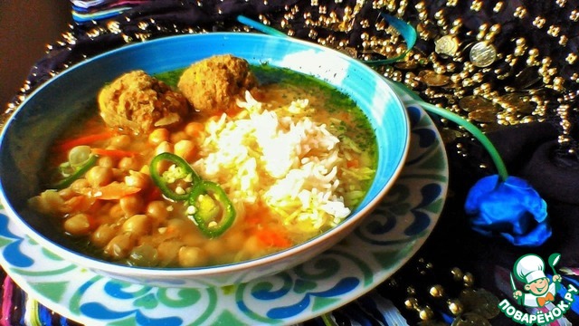 Подают этот суп так: в глубокую тарелку положить 2 ст. л. риса, 2 больших фрикадельки и залить бульоном с луком и нутом.