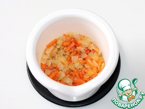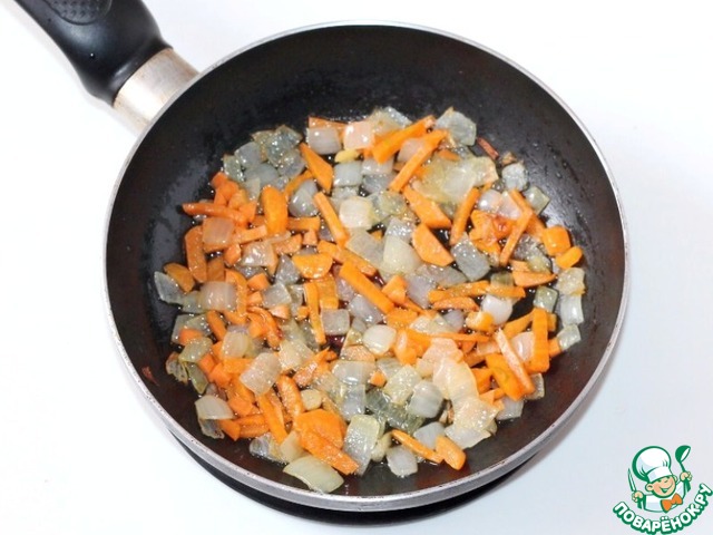 4. На чесночном масле обжариваем до прозрачности, очищенный и порезанный кубиками лук. Затем добавляем очищенную и порезанную соломкой морковь, пассеруем до готовности овощей.