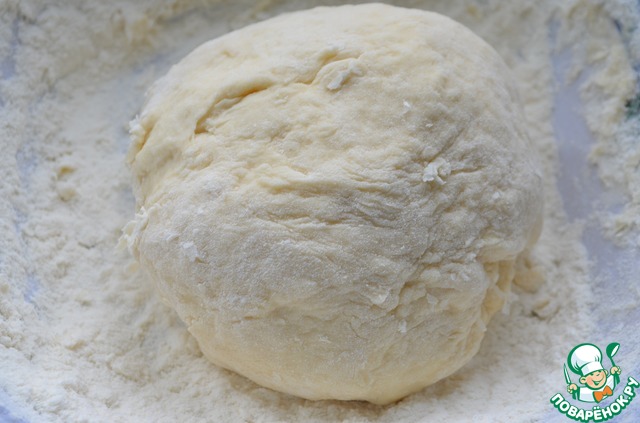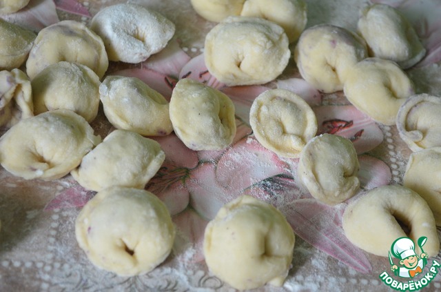 Через 15-20 минут разделите тесто три колобка. Каждый тонко раскатайте, вырежьте рюмкой кружочки, на каждый положите по 0,5 ч. л риса. Края теста соедините и защиплите в форме полумесяца.
