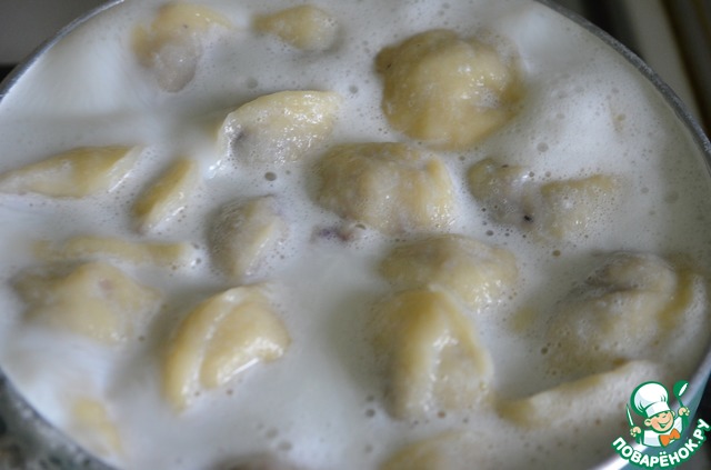Готовые варенички опустите в кипящие молоко, добавив немного соли и сахара. Варите, пока не всплывут. В конце варки добавьте сливочное масло.