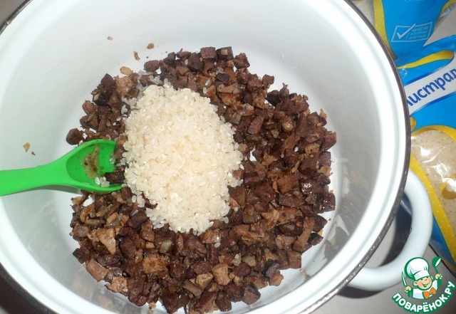 Нарезать мелко репчатый лук и все субпродукты. Обжарить на разогретом масле.