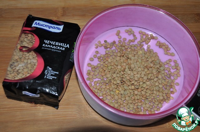 Берём чечевицу. Я выбрала зелёную канадскую от "Мистраль", она не требует предварительного замачивания. Заливаем водой 1 к 2, доводим до кипения и варим 10-15 минут до полу-готовности.