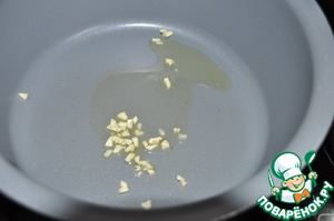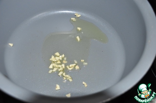 Одновременно мелко режем чеснок. В сотейник с толстым дном наливаем растительное масло, нагреваем, кладём чеснок.