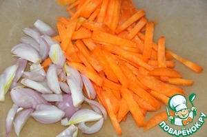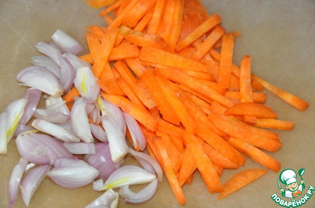 Тонкими полосками режем морковь, лук-шалот перьями.