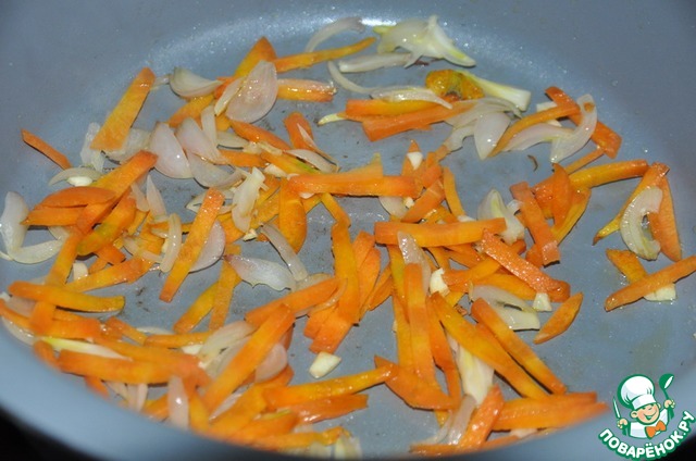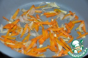 Как только появляется аромат чеснока, кладём в сотейник морковь и лук, обжариваем 3 минуты на среднем огне.