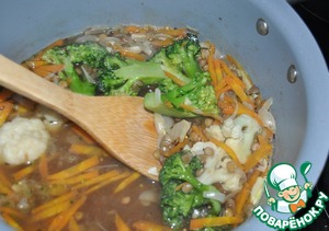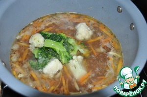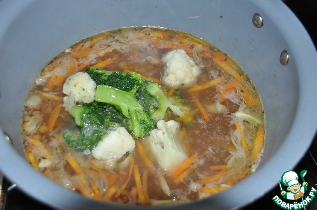 Кладём соцветия брокколи и цветной капусты, у меня мороженные. Доводим до кипения.