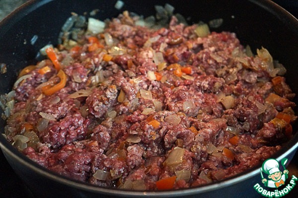 Выложить к нему фарш, перемешать, жарить, пока не выпарится почти вся влага.