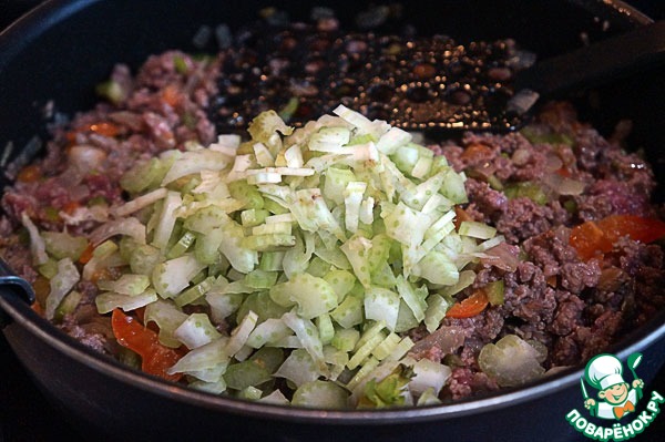 Добавить сельдерей, перемешать, тушить еще пять минут.