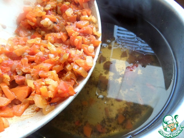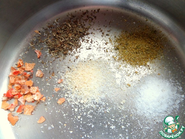В кастрюлю добавить приправы, специи. Перец острый высушенный раскрошен на кусочки слева.