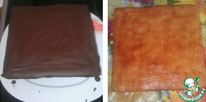 Один из коржей, можно промазать каким нибудь джемом (у меня было клубничное), далее поверхность залить шоколадом и оставить до застывания