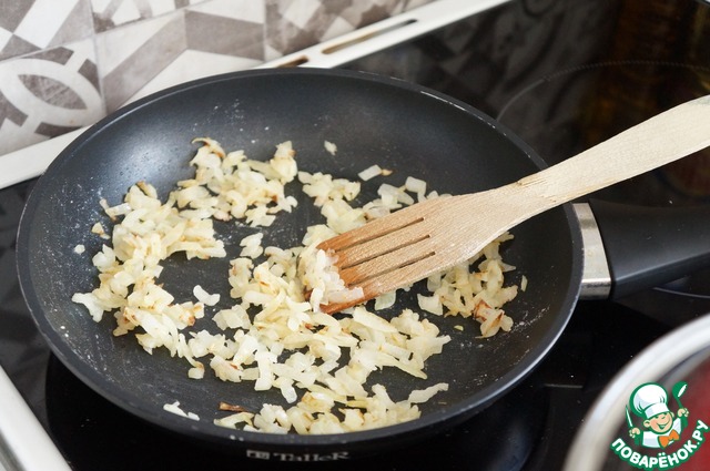 На сковороде на сливочном масле обжарить репчатый лук, в конце добавить немного муки, перемешать. Отправить в бульон.