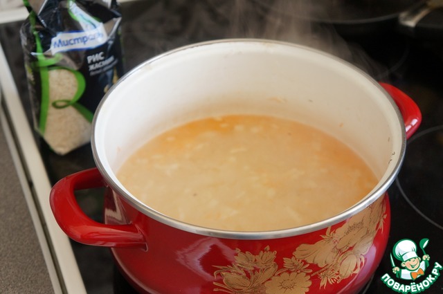 Рыбу и лавровый лист вынуть, бульон процедить, добавить рис примерно полчашки.