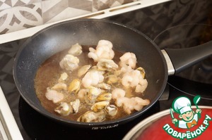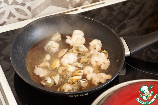На той же сковороде, где жарился лук, разогреть в соевом соусе морепродукты. У меня креветки и мидии.