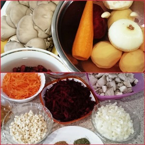 Пока фасоль варится чистим и режем остальные овощи. Картофель (4 шт режем кубиком, а 1 шт. кладем в кастрюлю к фасоли целиком.), лук, корень сельдерея и перец - кубиком. Свеклу и морковь я потерла на крупной терке. Капусту тонко шинкуем. Грибы хорошо промываем и постараемся порезать крупными кубиками, приблизительно как картофель.