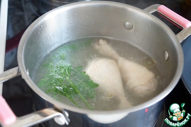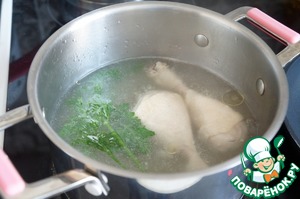 Такой суп с богатым составом вполне можно готовить и без мяса. Но у меня вариант на курином бульоне. Бульон я сварила из голеней с добавлением пучка зелени.