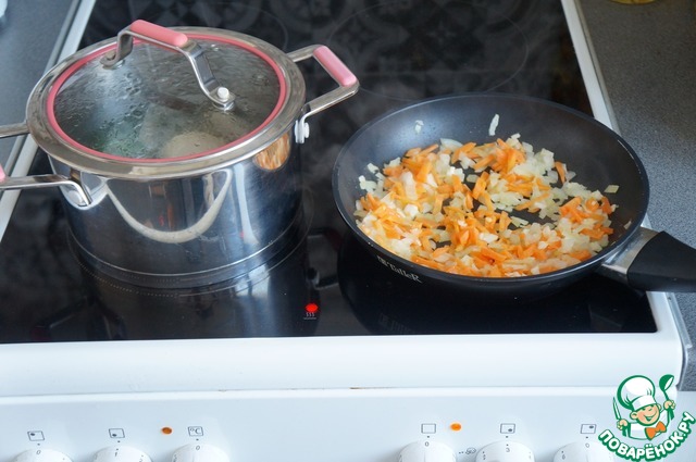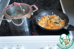 Пока варился бульон, слегка пассировала нарезанные лук, чеснок, морковь.