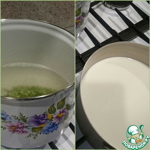• Промытый горох помещаем в кастрюлю с водой, доводим до кипения и после закипания варим 30 мин. Молоко кипятим в отдельной кастрюле, снимаем пенку и отставляем.
