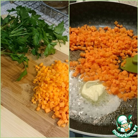 • Пока горох варится, надо нарезать морковь мелкими кубиками и спассеровать на сливочном масле в сковороде.