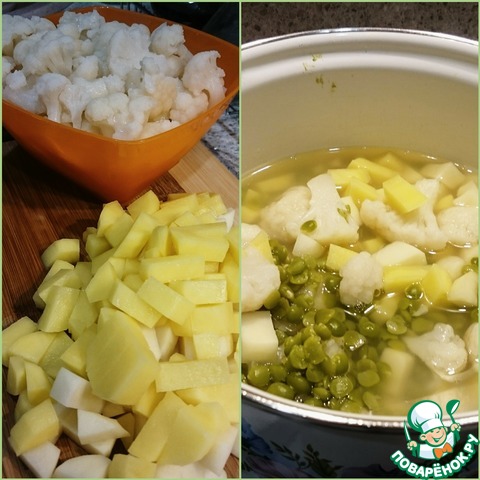 • По истечении 30 минут горох посолить, добавить порезанный мелкими кубиками картофель и разобранную на соцветия цветную капусту. Проварить еще 15 минут.