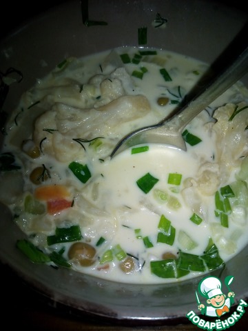 При этом делался на консервированном горохе и замороженной цветной капусте, а из Зелени: укроп, корни сельдерея и в тарелку перья лука.