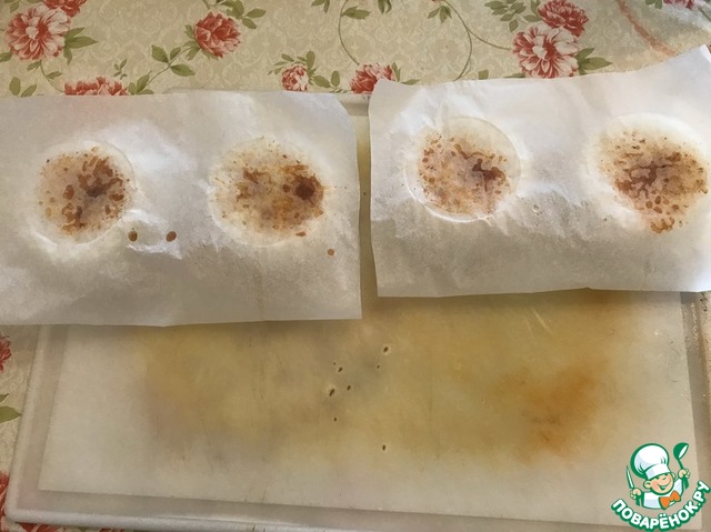 Складываем 4 рисовые лепёшки в сковороду вместе с пергаментной бумагой закрывающей рис с 2 сторон. -