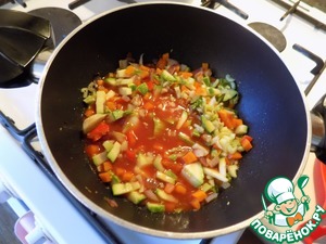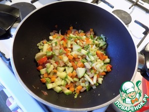 Нам понадобится кастрюля с толстым дном, где мы будем варить суп или глубокий сотейник. Наливаем оливковое масло 1 ст л, разогреваем его и выкладываем красный лук. Немного его обжариваем и кладём далее морковь, обжариваем ещё пару минут и выкладываем сельдерей, перец и кабачок. Убавляем огонь, перемешиваем и томим овощи минут 10.