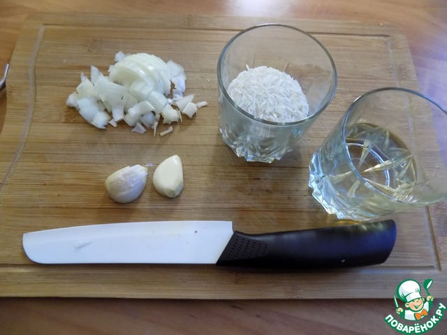 Для этого нам понадобится рис, сухое вино, репчатый лук, чеснок и 2 ст л оливкового масла.