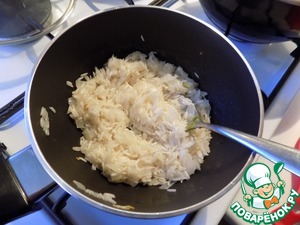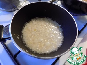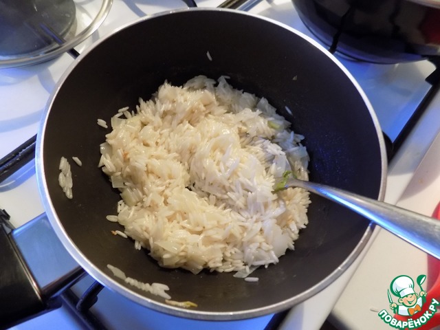 В другом сотейнике или высокой сковороде в разогретом масле обжариваем чеснок, раздавленный плоской стороной ножа, 2 зубчика. Через минуту, когда чеснок отдаст аромат маслу, убираем его и выкладываем лук репчатый мелко резанный. Золотим его и насыпаем рис. Рису даём впитать в себя масло и делаем его до прозрачности.