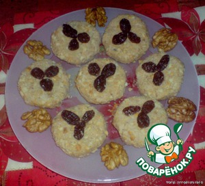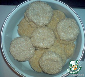 Хорошо перемешиваем и убираем минут на 15 в холодильник. Достаем и лепим пирожные. Можно сделать в виде шариков, а можно в виде колбасы. Я решила сделать такие лепешки. В серединку я положила еще по изюмине (размачивать не надо, изюм и так набухнет внутри). Обваливаем в кунжуте или крошке печенья.