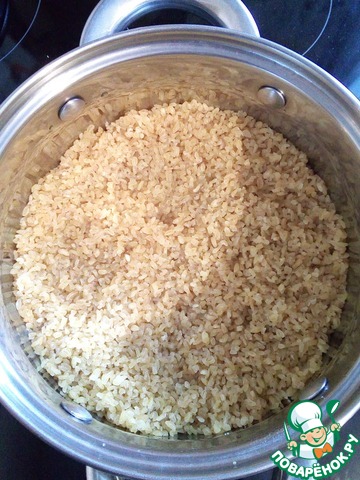 Сверху выкладываем промытый булгур, слегка утрамбовываем.